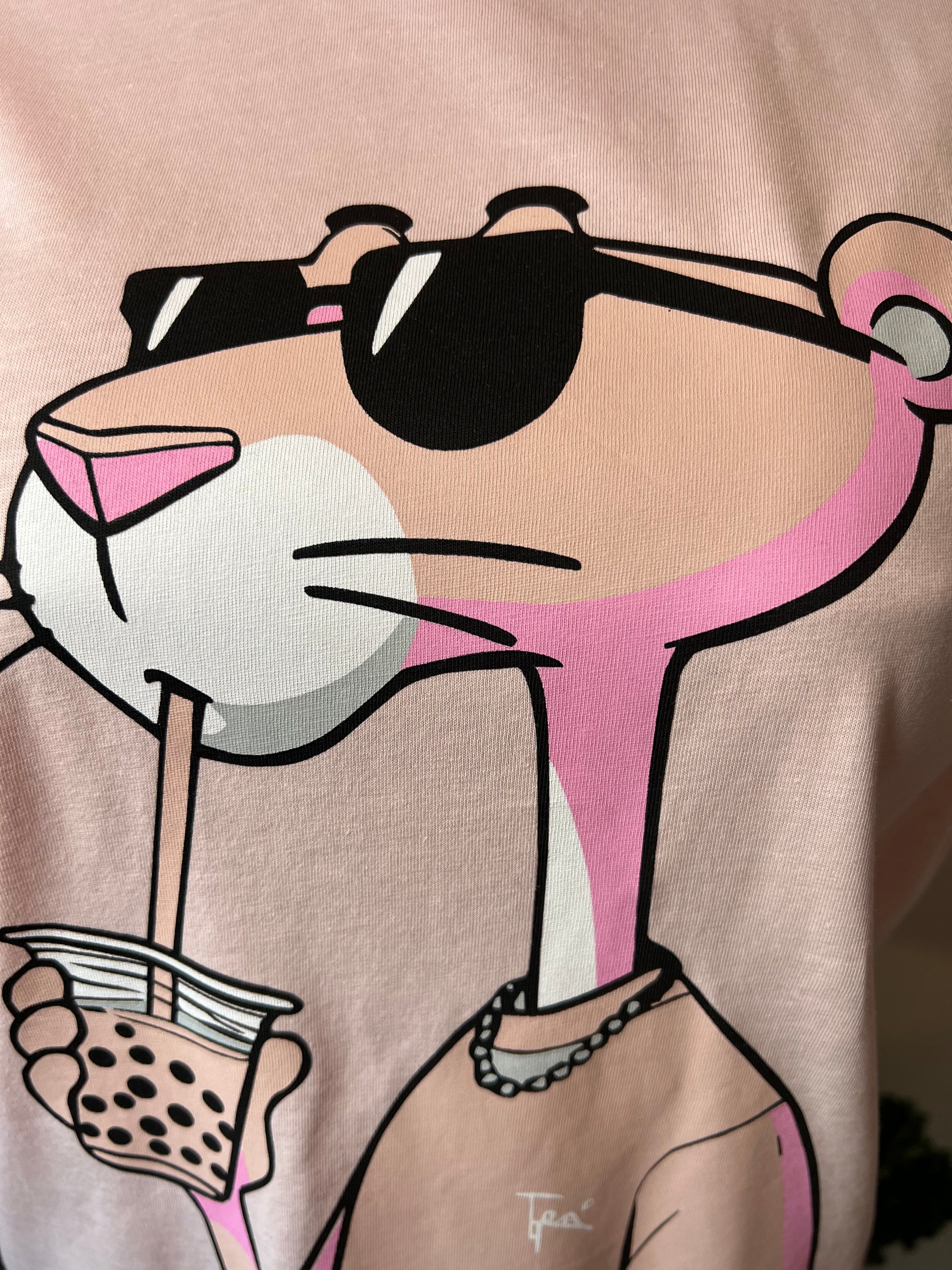 Let the Pink Panther do the talking in this laid-back graphic tee! Featuring the iconic panther in sunglasses, sipping boba and serving looks, this oversized pastel pink tee is made for fashionistas who love fun, relaxed style with a twist.