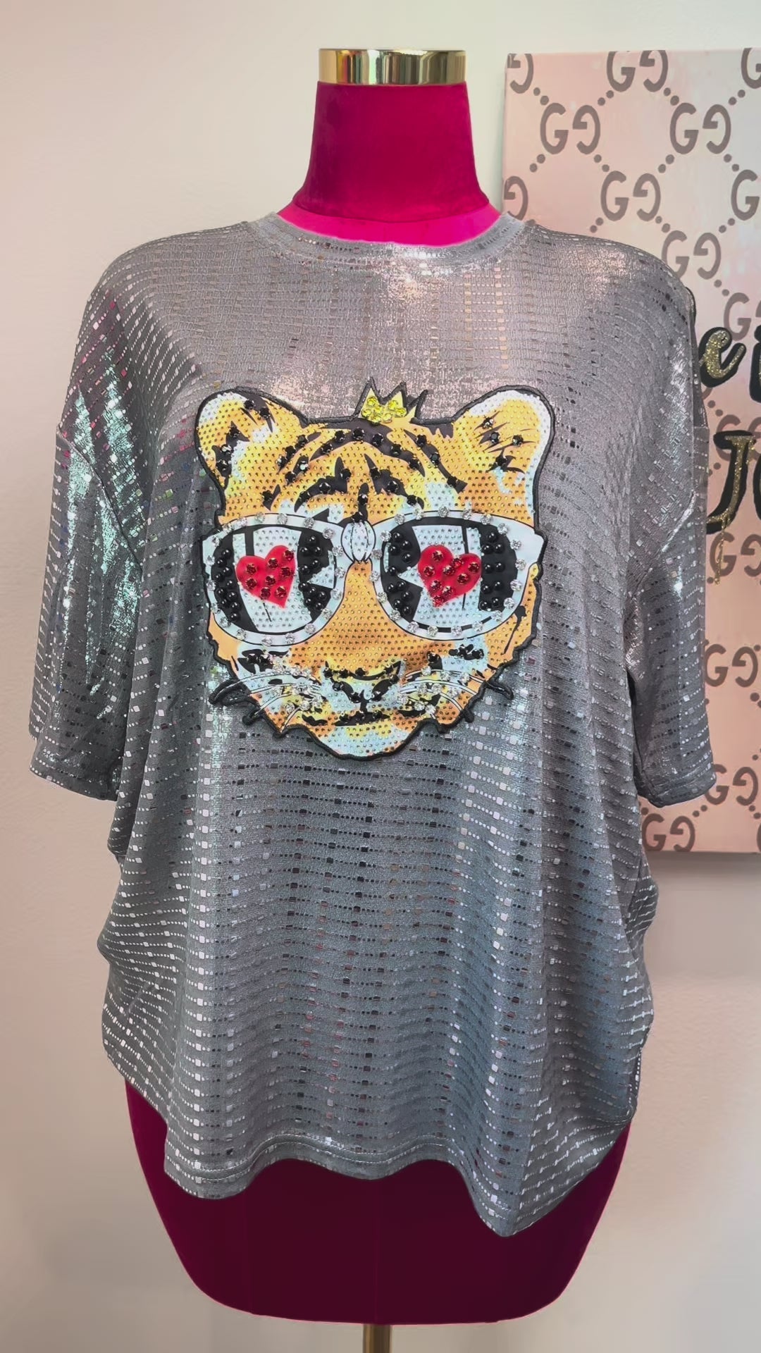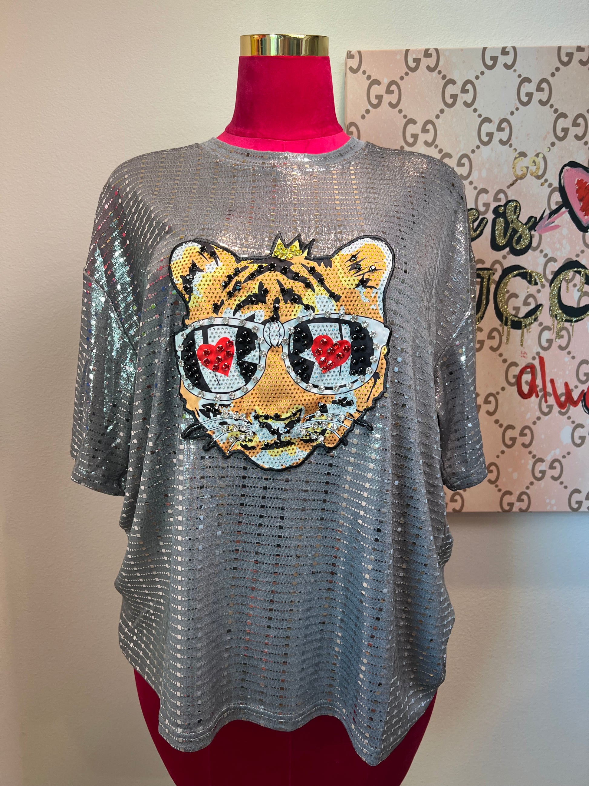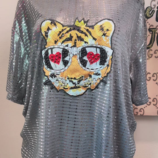 Shine bright and stay wild in our Fierce in Love Tee! This dazzling silver sequin top features a glam tiger rocking rhinestone heart-shaped glasses and a golden crown – perfect for the confident queen with bold style and big love energy.