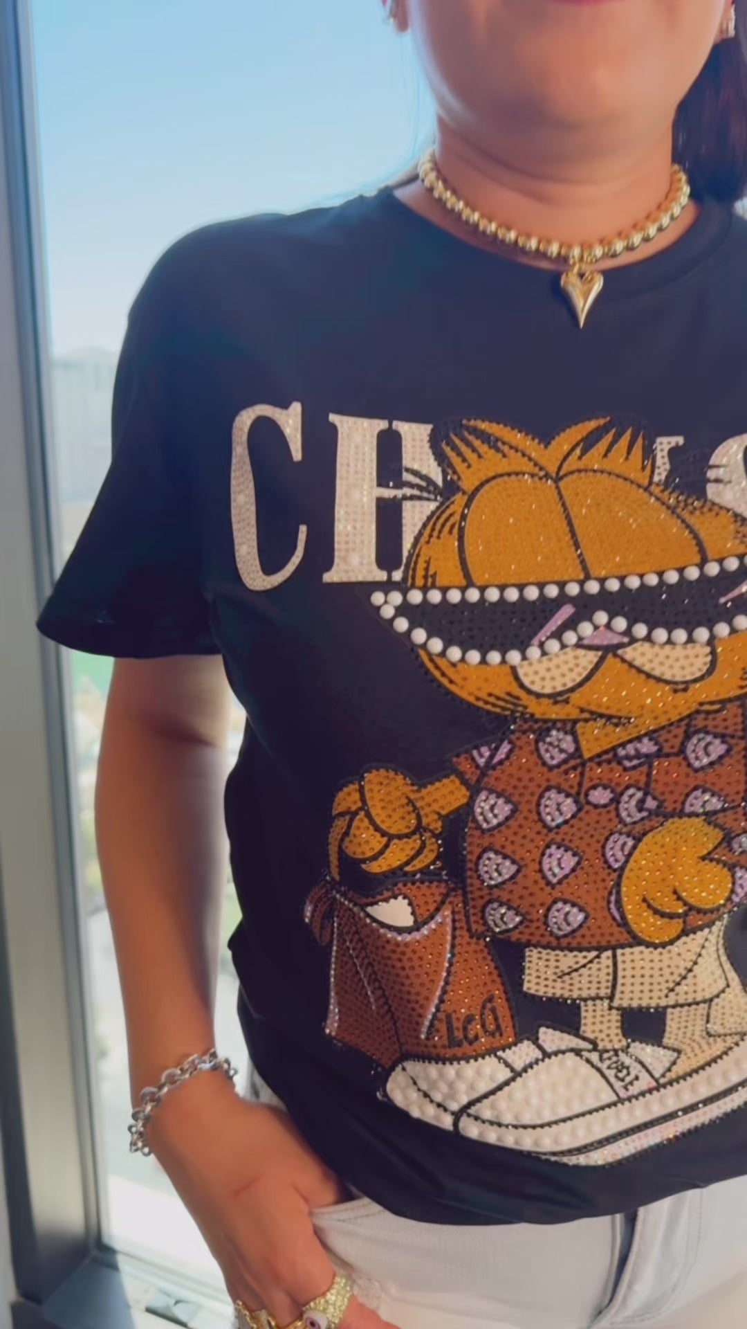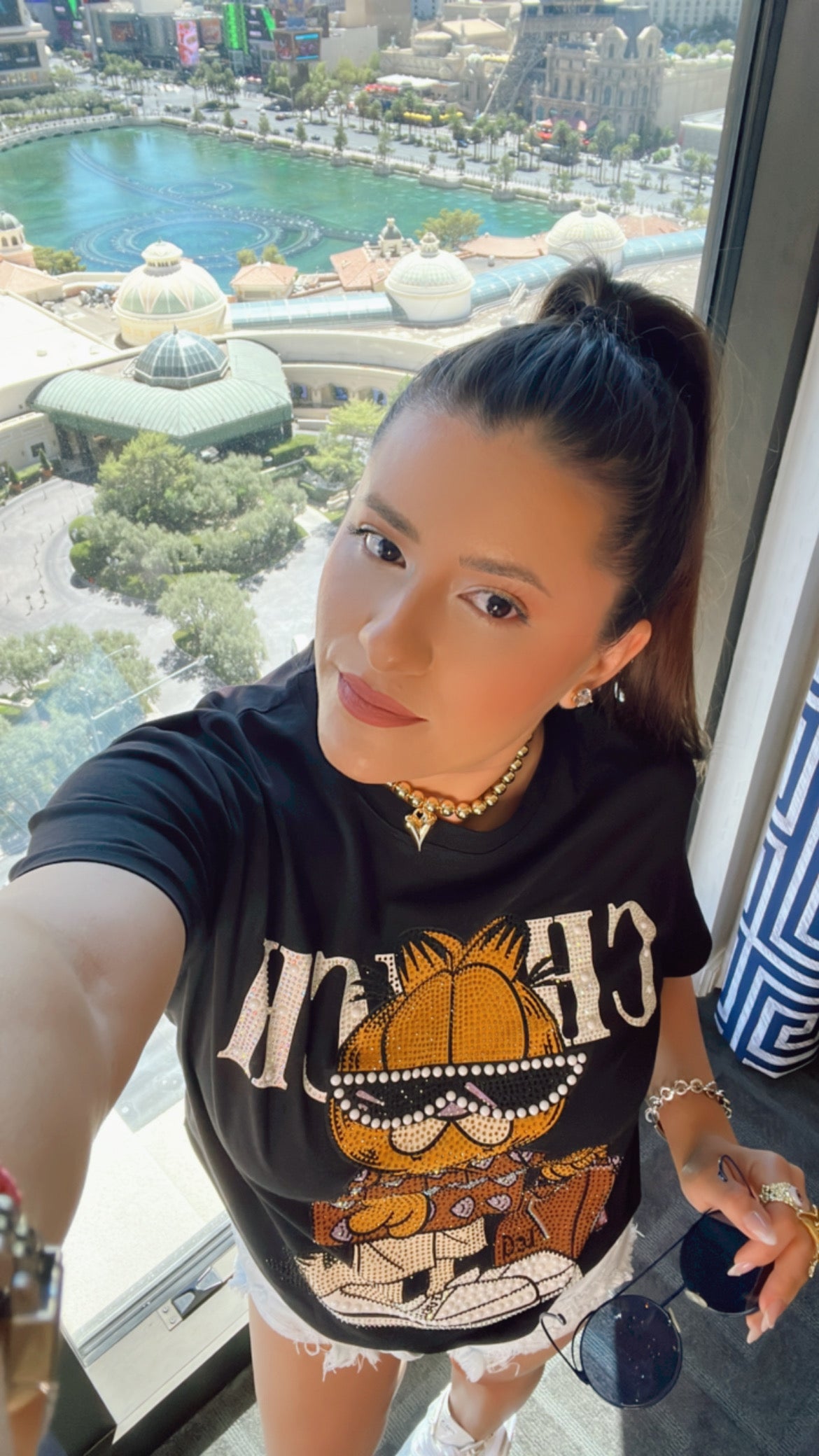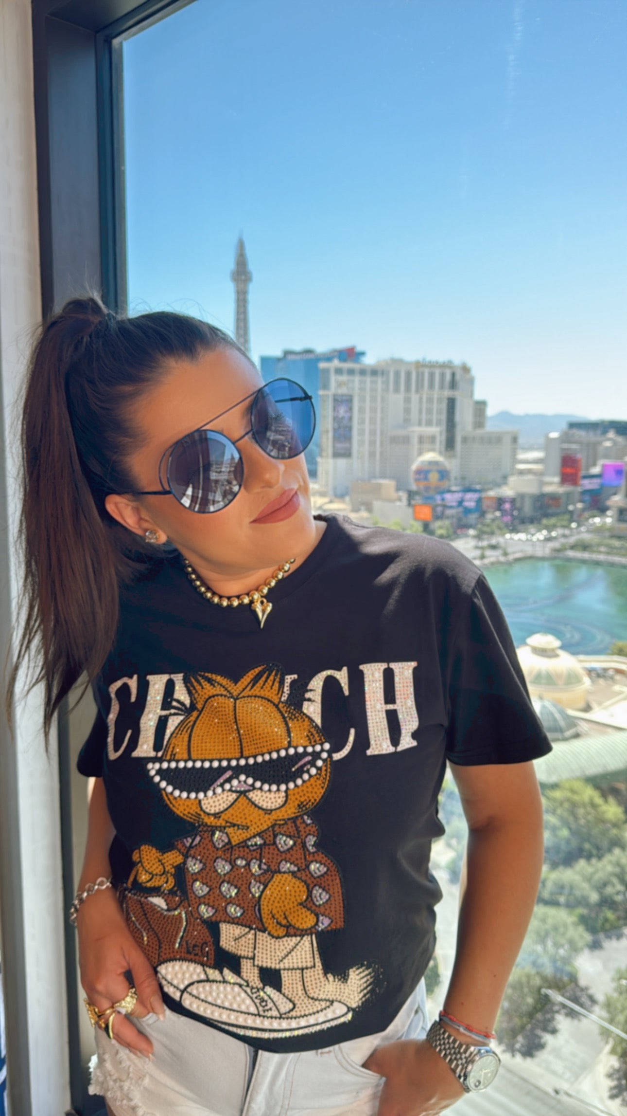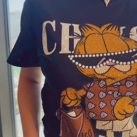 😎 Camiseta negra con estampado de Garfield con pedrería