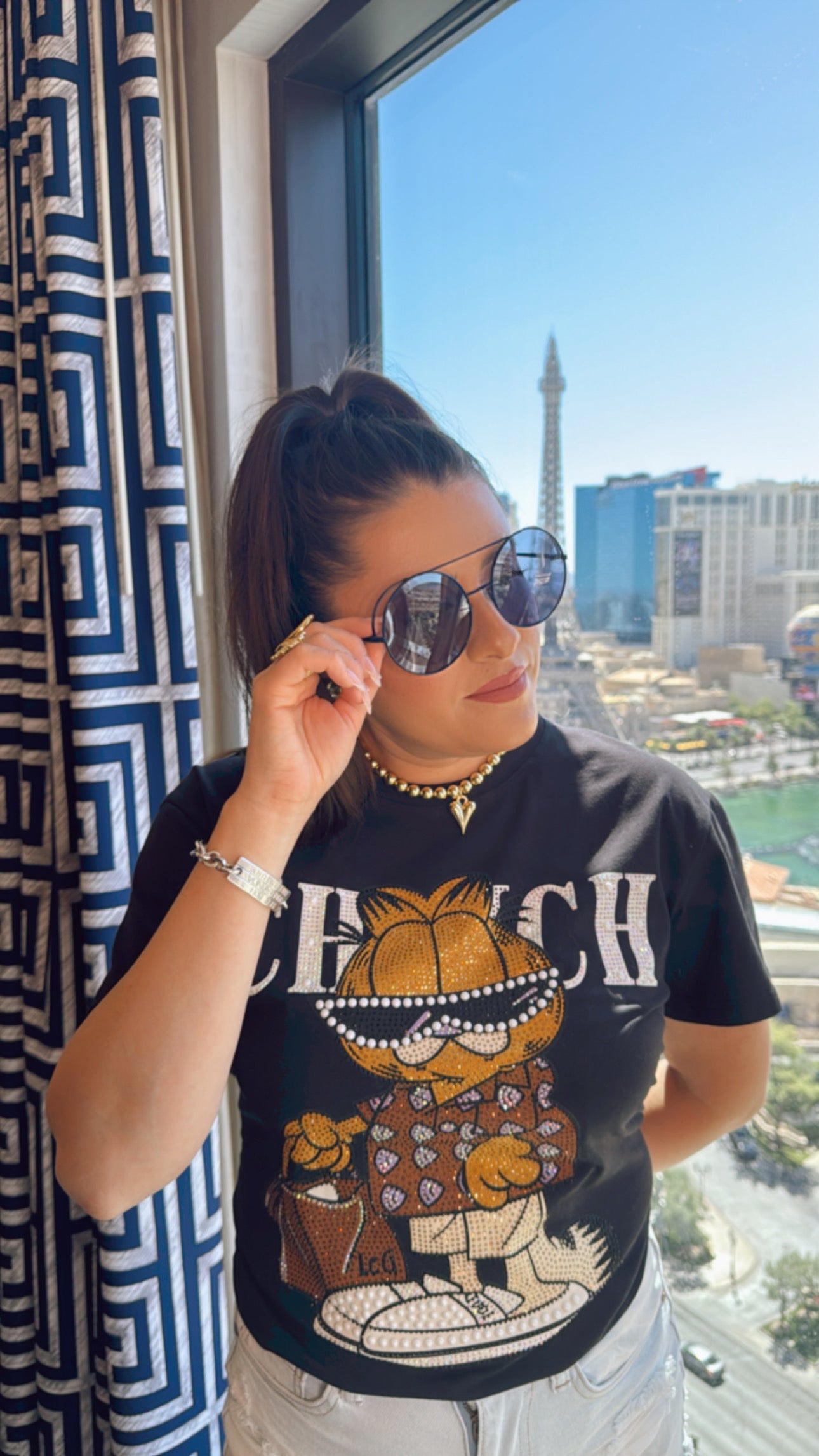 This black graphic tee features the iconic Garfield rocking shades and a flashy outfit with rhinestone-style details that add sparkle to your casual look. Perfect for pairing with shorts, jeans, or even layering under a jacket for that playful yet chic vibe.