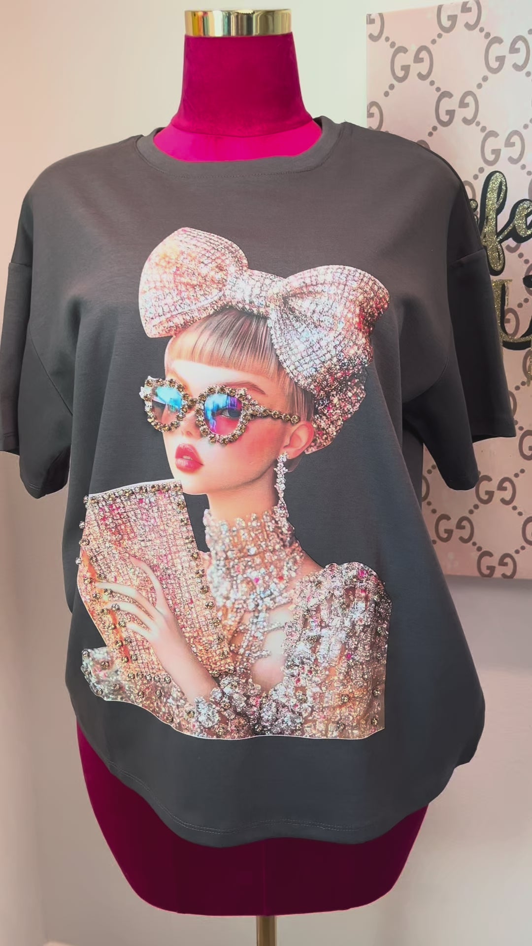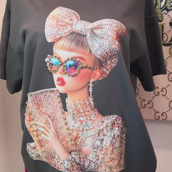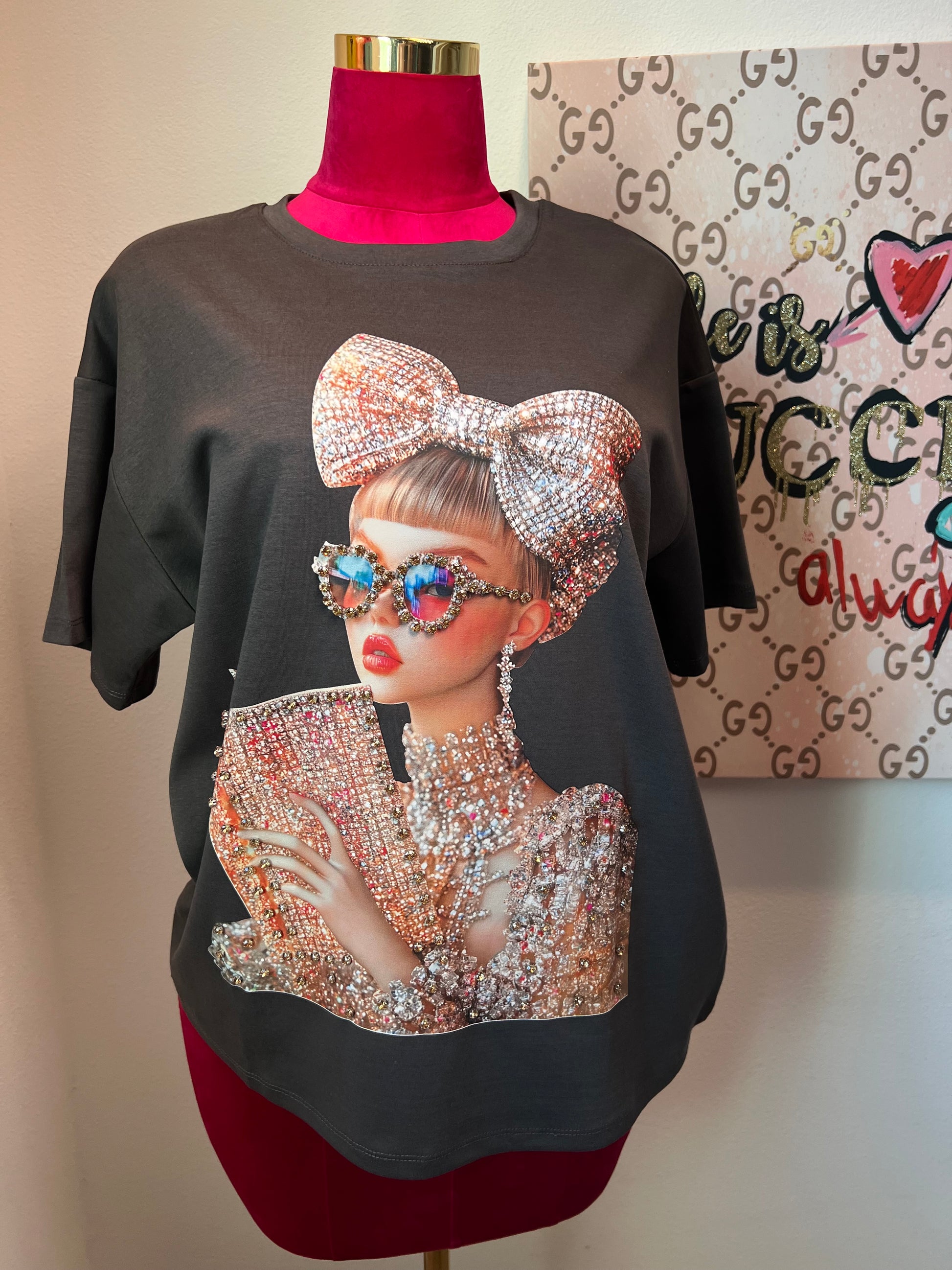 Chic, classy, and dripping in sparkle! This luxe tee features a glamorous fashionista wearing crystal-covered sunglasses, a glittering oversized bow, and a dazzling jeweled outfit β all while holding a bejeweled book. For the bold woman who reads, leads, and shines.