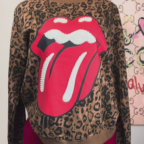 ¡Saca tu lado más rockero con nuestra Sudadera Wild Rock Glam! Estampado de leopardo con el famoso diseño de labios y lengua en rojo, decorado con perlas brillantes que le dan un toque glamuroso y poderoso.
