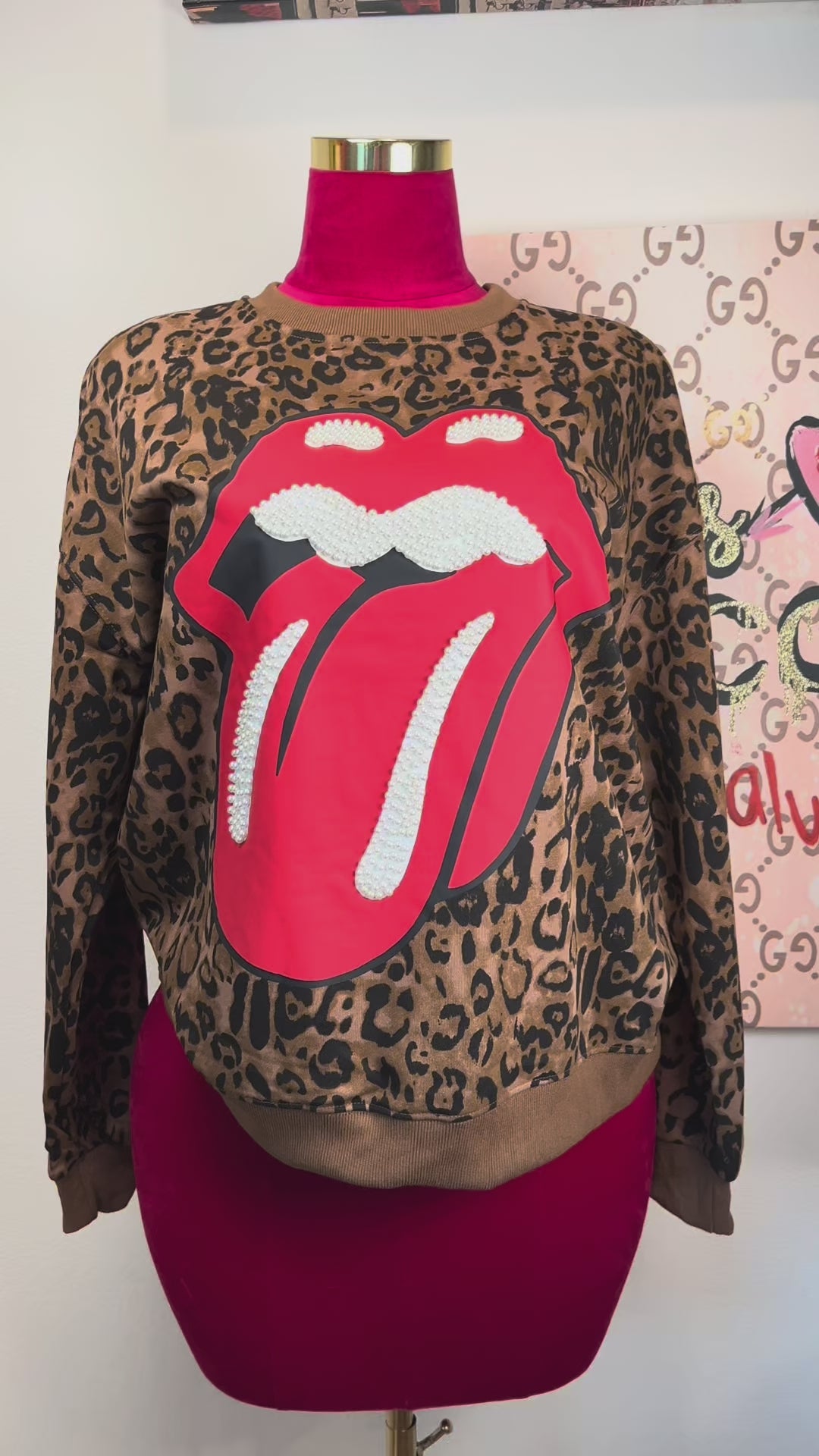 Unleash your inner rockstar with our Wild Rock Glam Sweatshirt! This leopard-print statement piece features a bold red lips-and-tongue graphic embellished with sparkling pearls for that fierce glam finish. It’s edgy, comfy, and ready to turn heads.