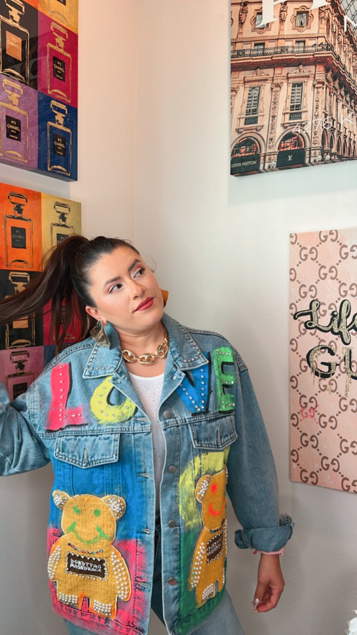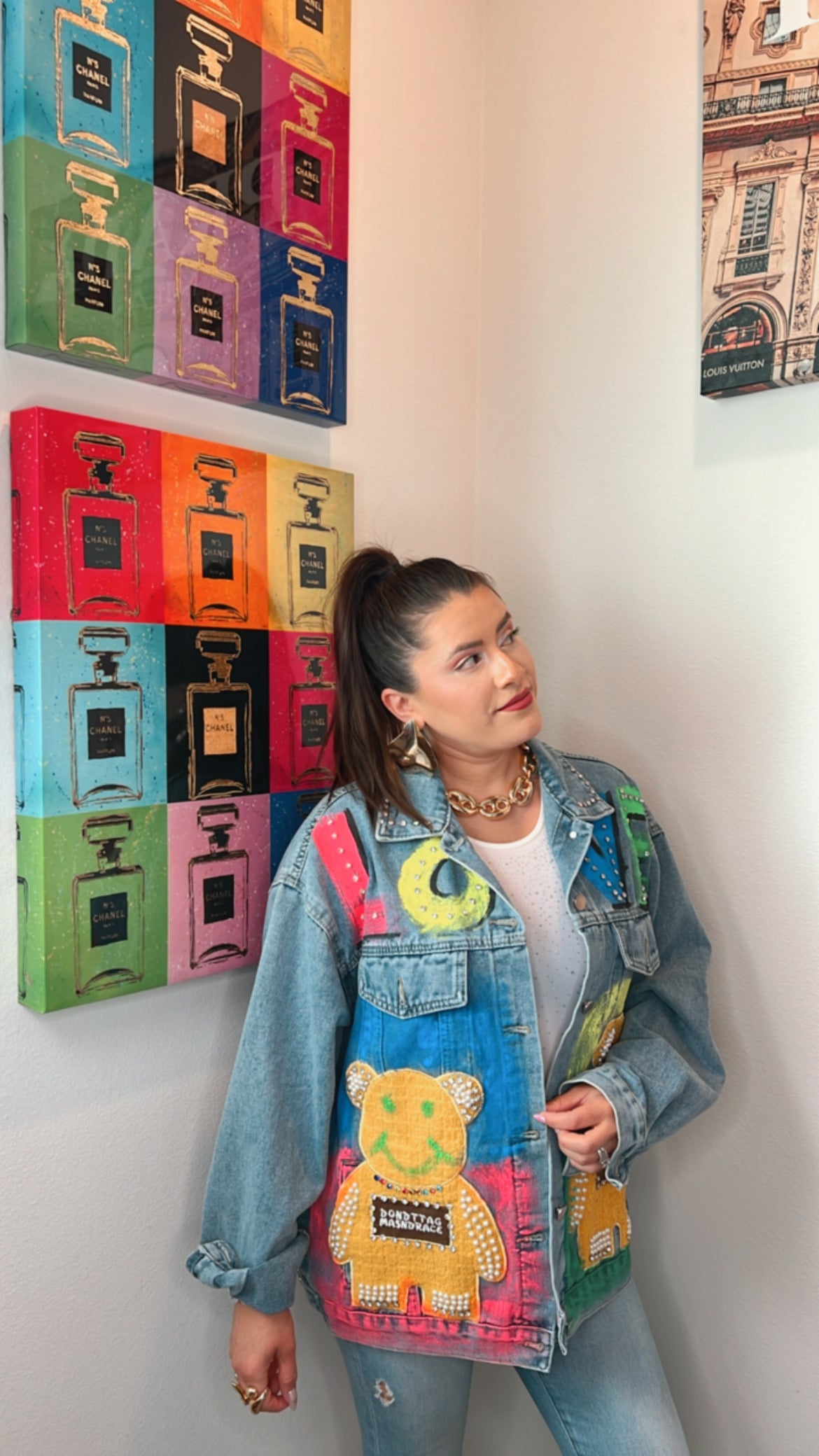Esta chamarra de mezclilla estilo oversize es moda en su máxima expresión: con detalles pintados a mano, aplicaciones de ositos llenos de color y brillos de pedrería que le dan un toque original y juguetón. Perfecta para destacar en festivales, salidas casuales o cada vez que quieras que tu outfit hable por ti.