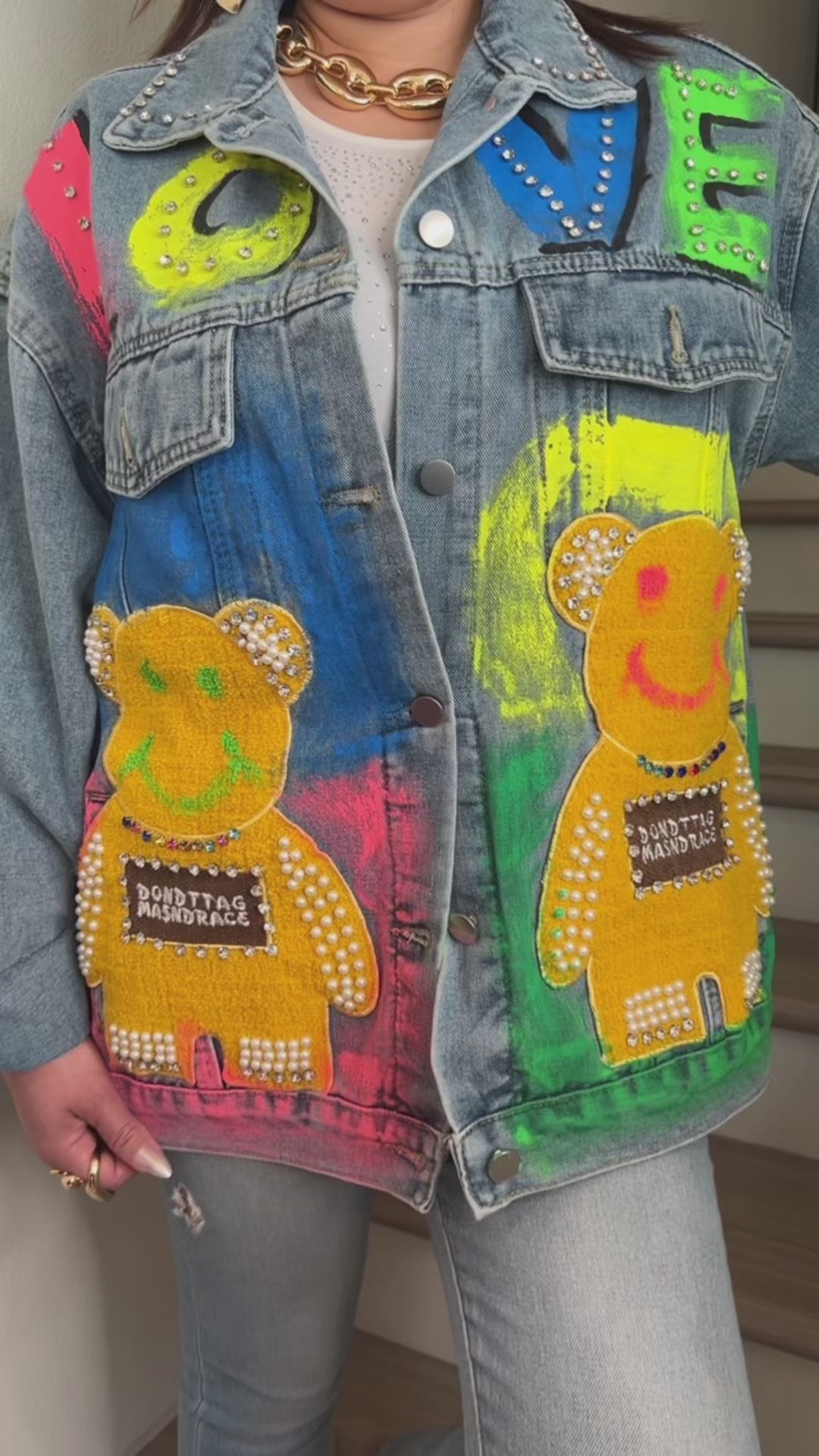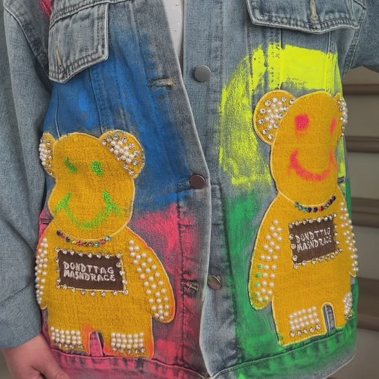 This oversized denim jacket is pure statement fashion – featuring colorful hand-painted details, rhinestone accents, and playful teddy bear patches that pop with personality. Perfect for standing out at festivals, casual outings, or whenever you want your outfit to speak for itself.