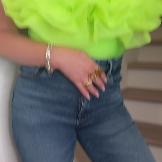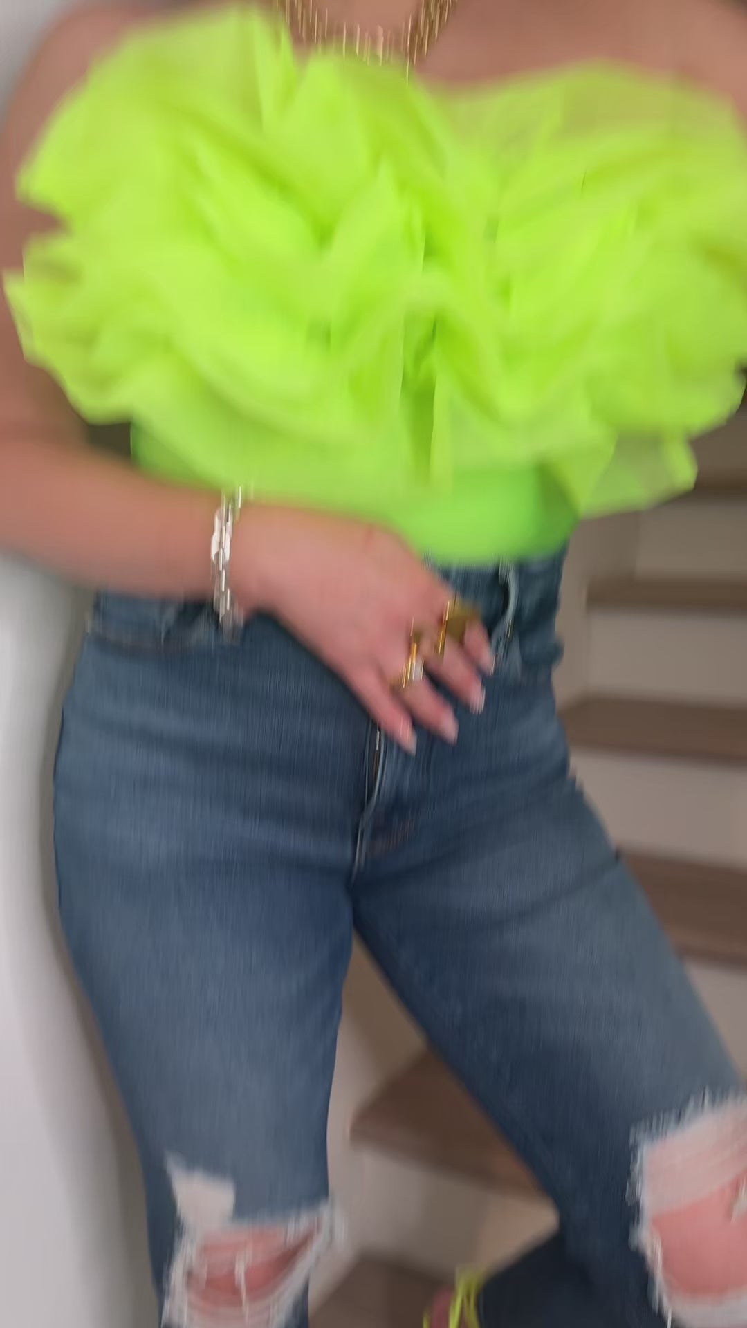 Turn heads with this statement neon green ruffle top that’s anything but ordinary. The dramatic layered ruffles add instant volume and glam, while the strapless design keeps it chic and feminine. Perfect for nights out, parties, or whenever you want to own the spotlight. Pair it with distressed jeans, sleek trousers, or a skirt for a look that screams confidence.