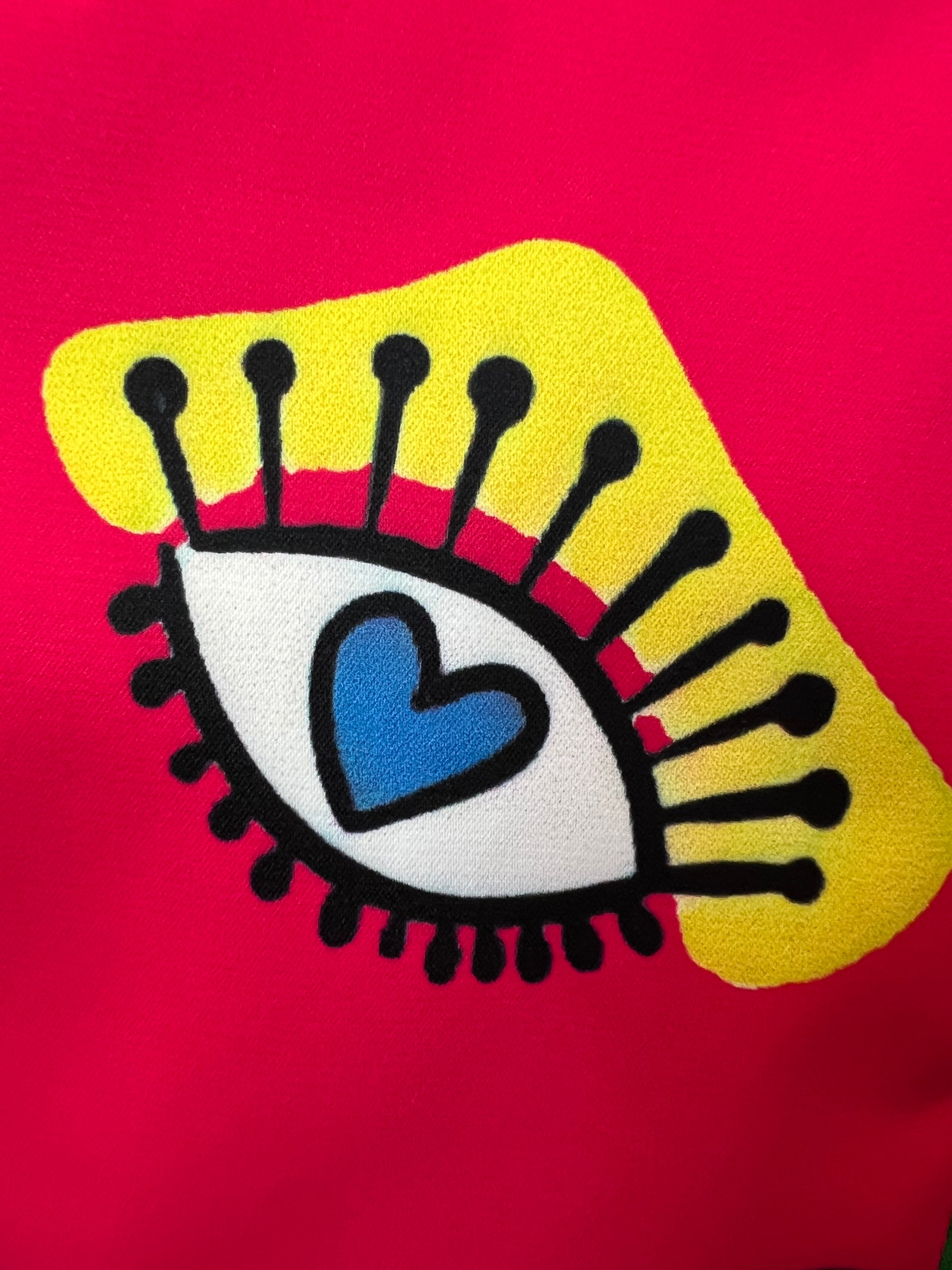 Step into the spotlight with our Pop Art Power Blazer! This vibrant fuchsia blazer features colorful pop art-inspired eyes, lips, and hearts that scream confidence. Whether you’re dressing up for an event or styling it street-chic, this piece guarantees compliments.