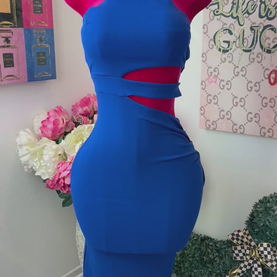 Este vestido azul eléctrico con cut-outs laterales es ideal para una noche de impacto. Su diseño ajustado con aberturas estratégicas realza la silueta de forma sexy y sofisticada. El escote halter estiliza el cuello, mientras que el cierre invisible en la parte trasera asegura un fit perfecto. El corte asimétrico en la parte baja le da un toque moderno y elegante.
