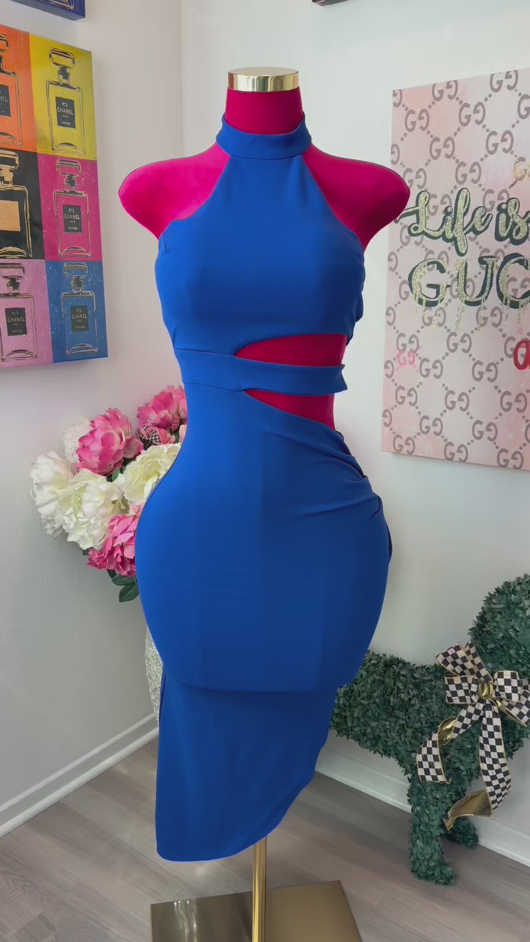 This electric blue cut-out midi dress is made for a bold, confident night out. The sleek halter neckline elongates the neck while the side cut-outs highlight your curves in all the right places. It features a hidden zipper in the back for a seamless fit, and an asymmetrical hem that adds a modern edge. 97% Polyester 3% Spandex