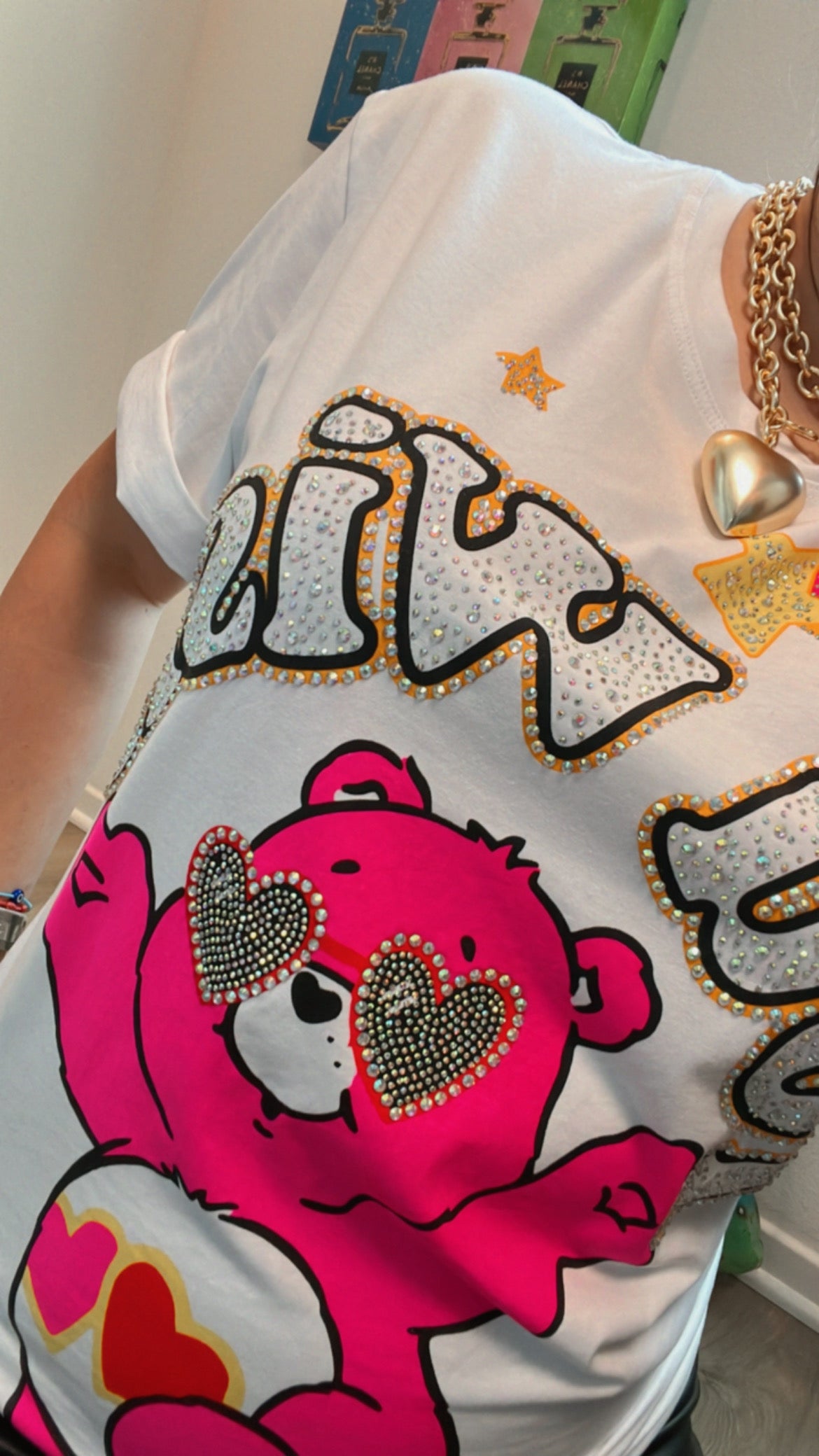 Esta camiseta lo dice todo: ¡Sigue soñando! Con un osito rosa intenso, lentes en forma de corazón con pedrería, estrellas brillantes y una vibra retro-glam, esta prenda es para chicas dulces… pero con carácter.