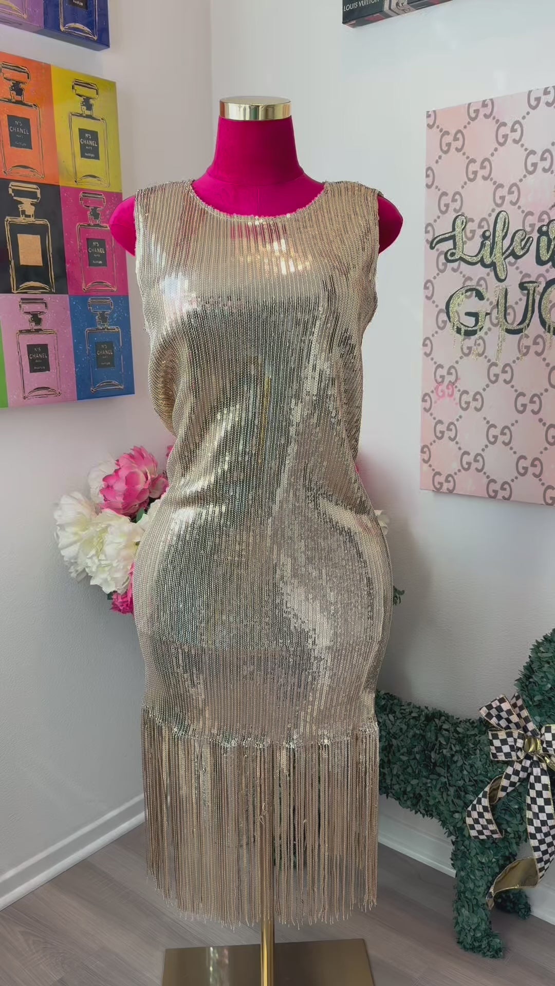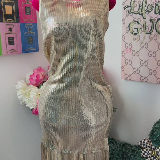 Turn heads in this full-length gold sequin fringe dress, designed to make you glow at every special occasion. The pull-on fit hugs your curves without zippers, while the golden fringe hem gives it a touch of vintage glam and fun movement. Perfect for parties, elegant dinners, or ringing in the New Year with sparkle.